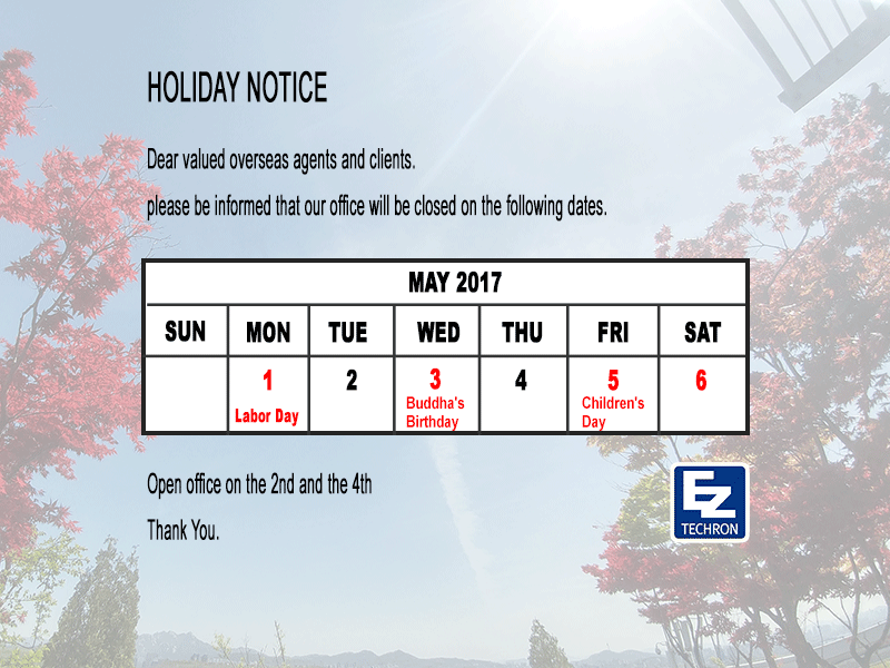 EZTECHRON IN MAY, HOLIDAY NOTICE.